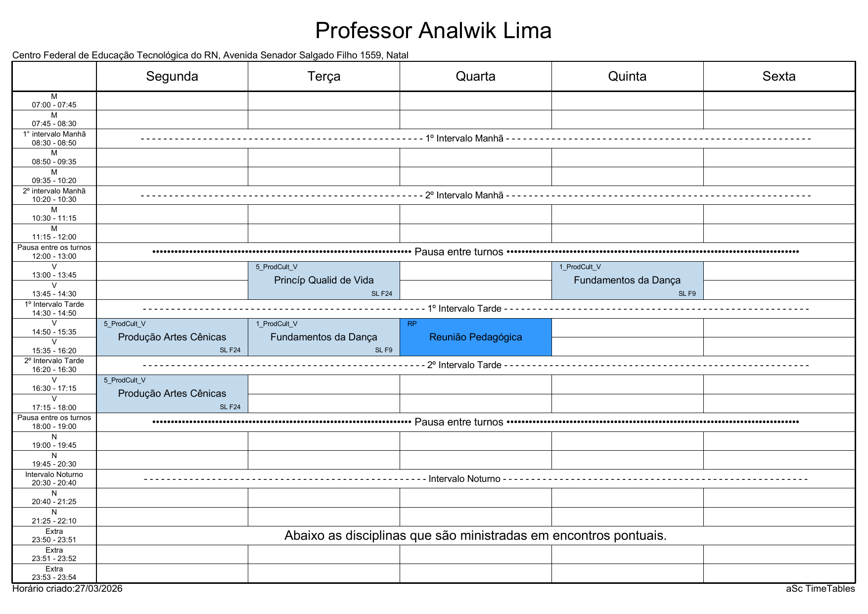 IFRN/Rocas: Horário