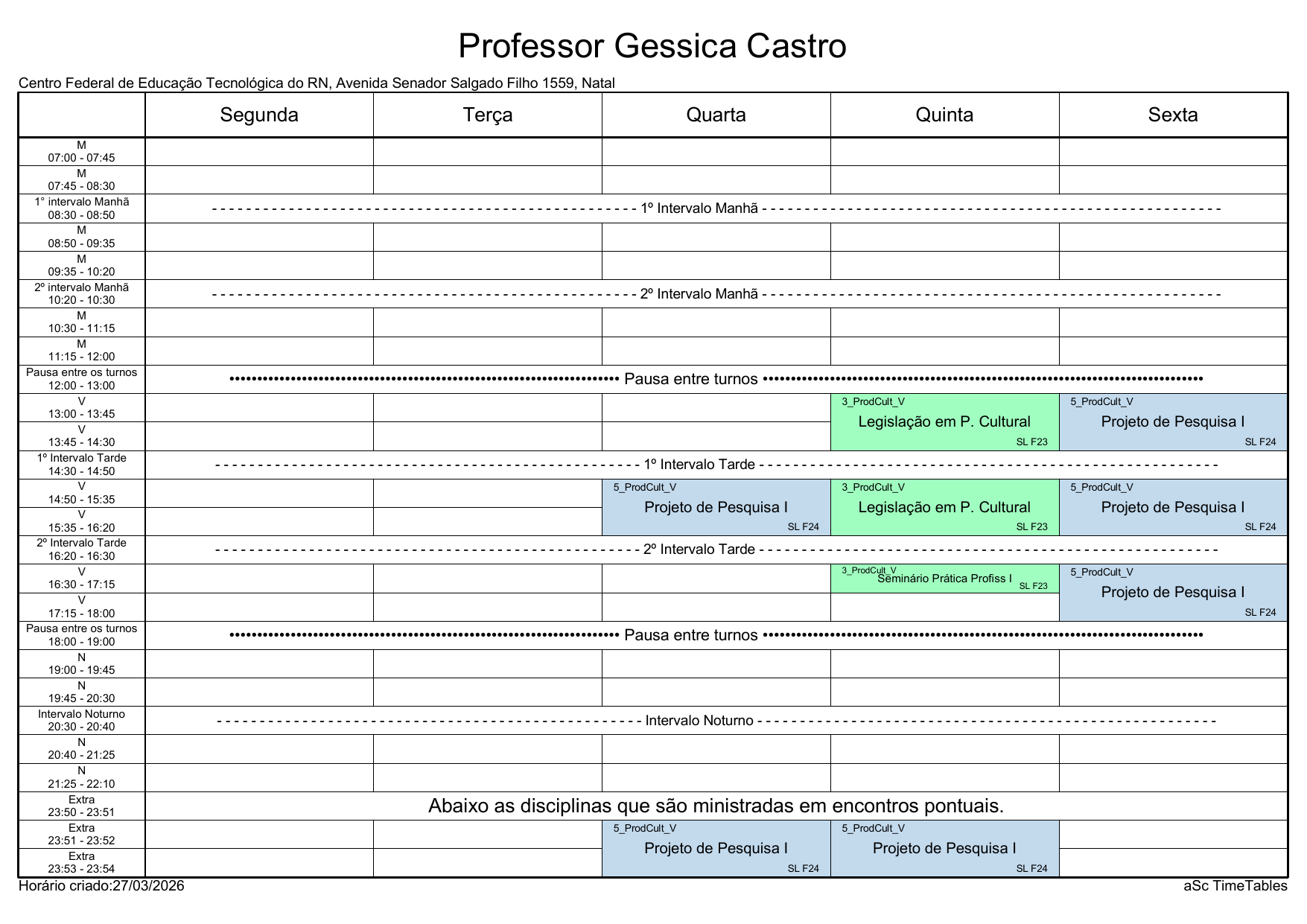 IFRN/Rocas: Horário