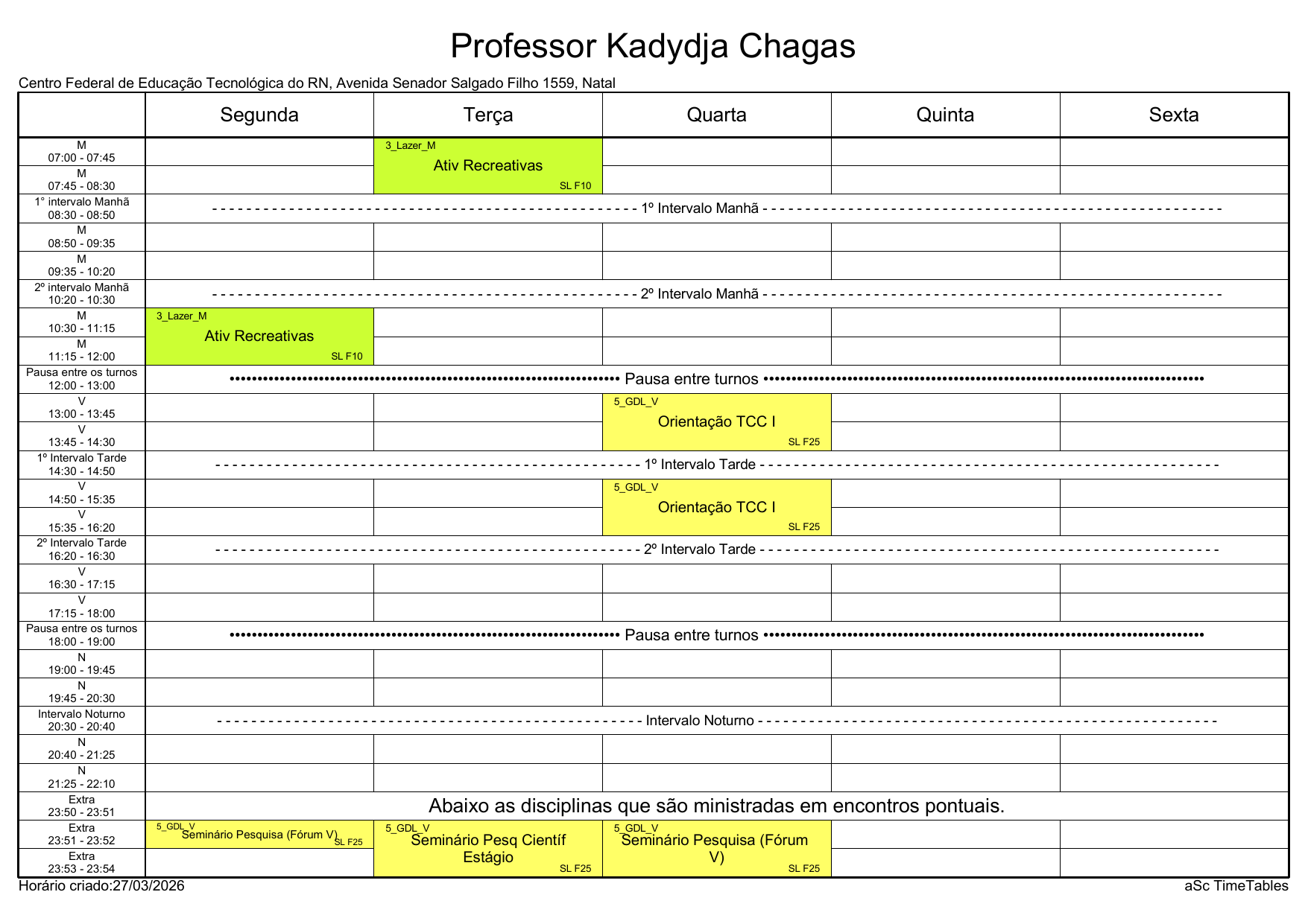 IFRN/Rocas: Horário