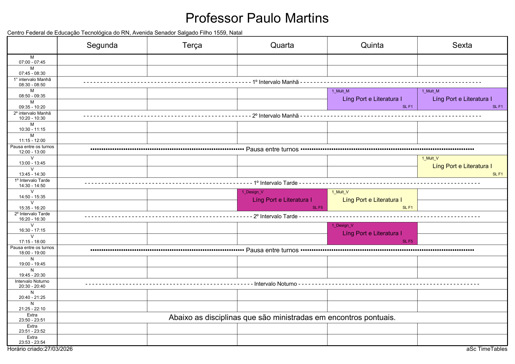IFRN/Rocas: Horário