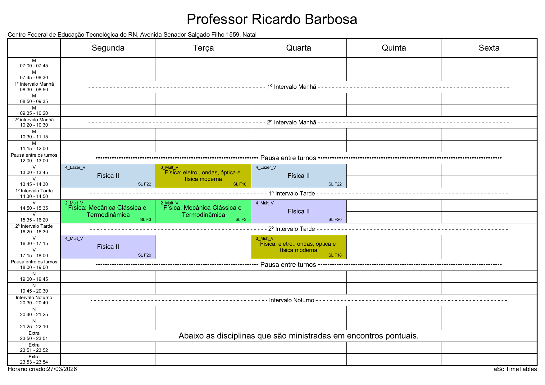 IFRN/Rocas: Horário