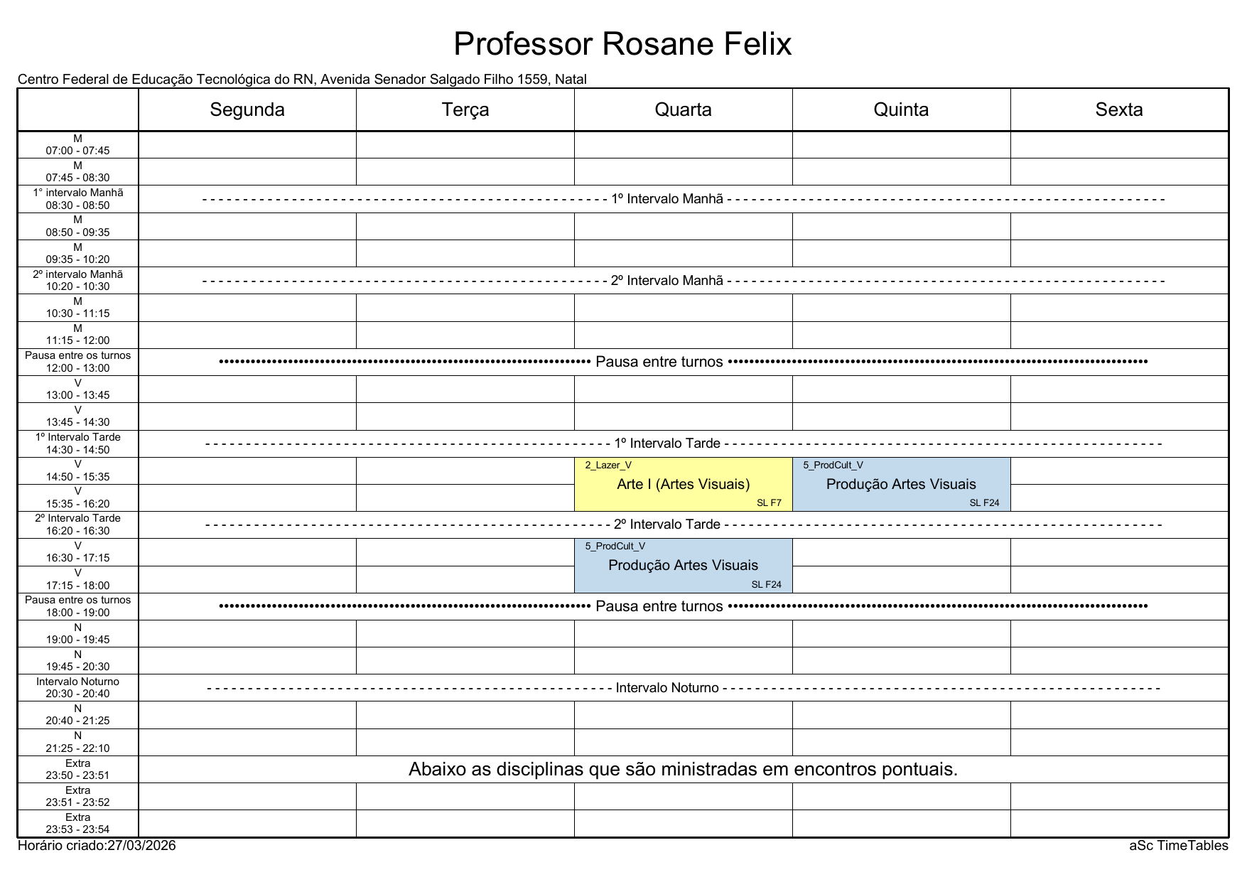 IFRN/Rocas: Horário