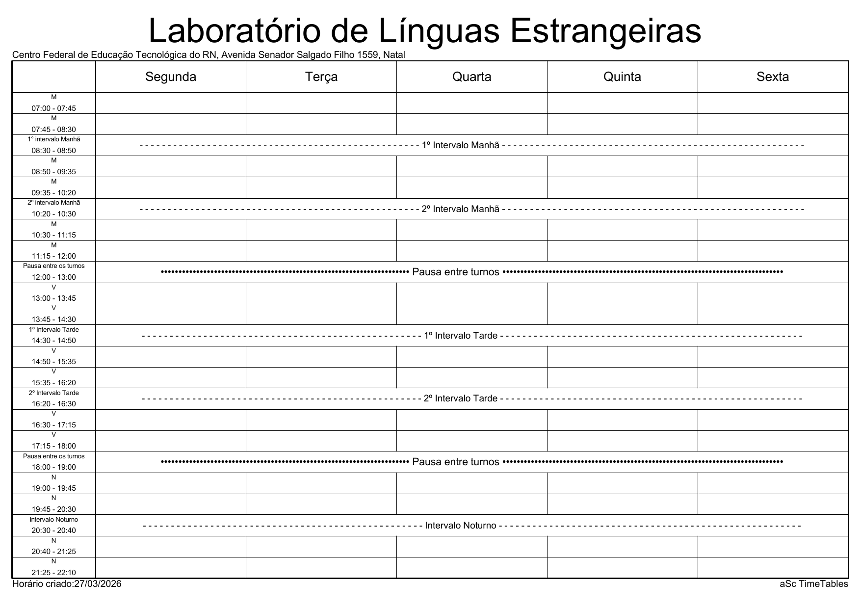 IFRN/Rocas: Horário