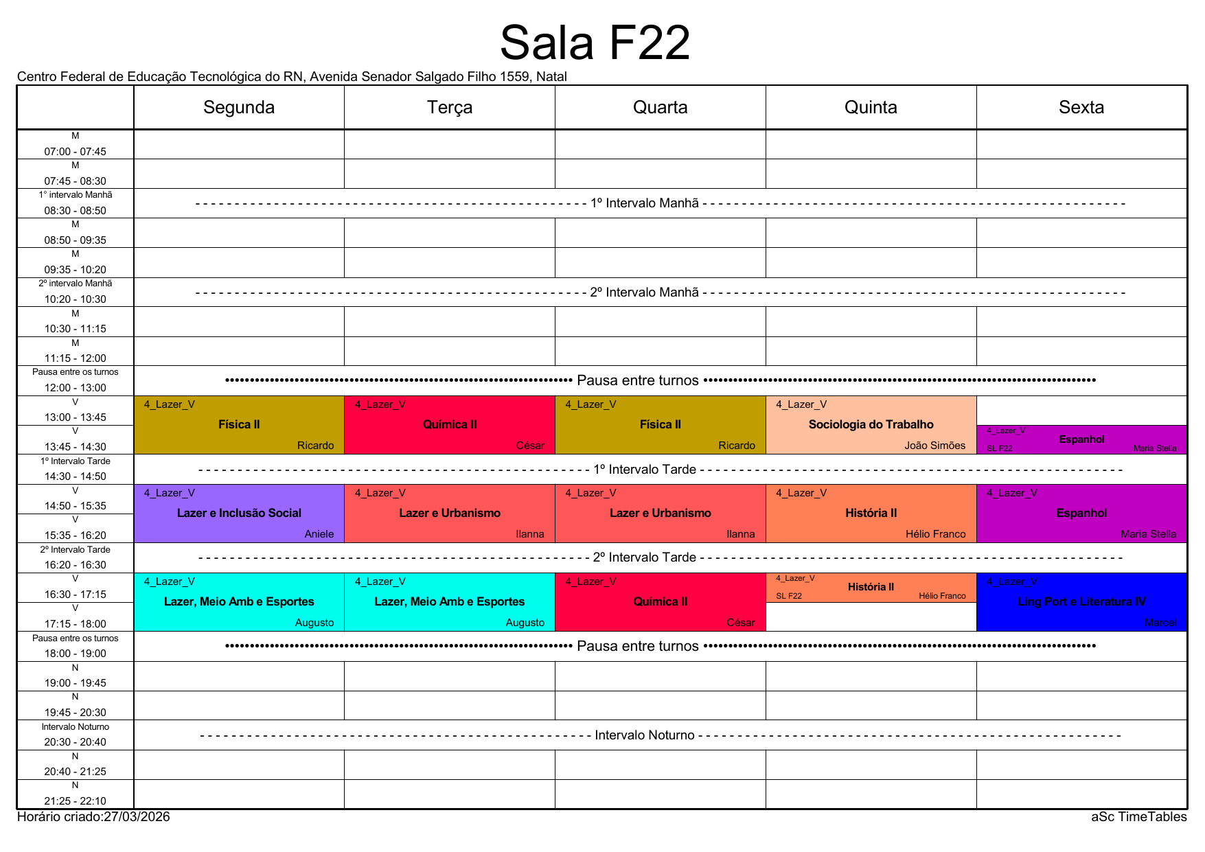 IFRN/Rocas: Horário