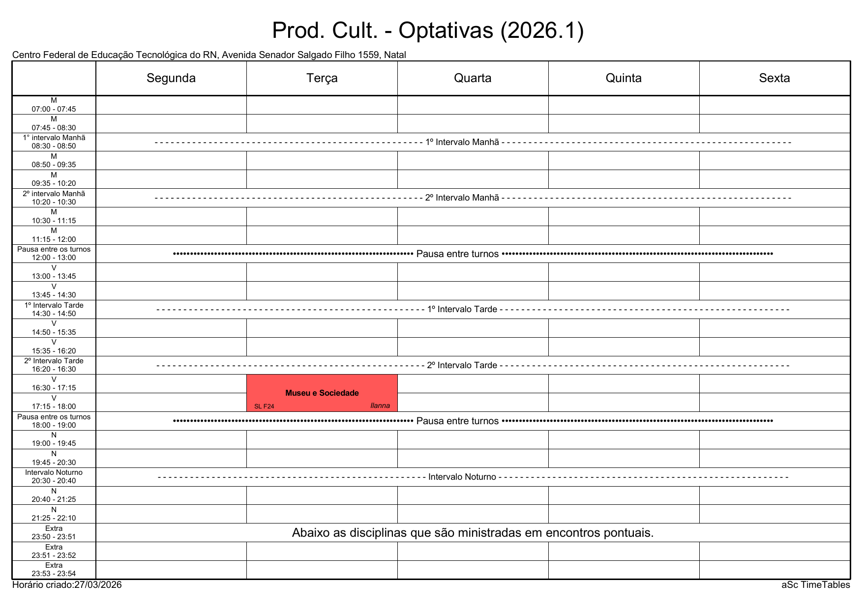 IFRN/Rocas: Horário