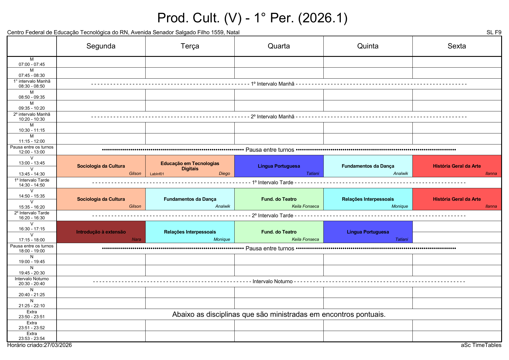 IFRN/Rocas: Horário