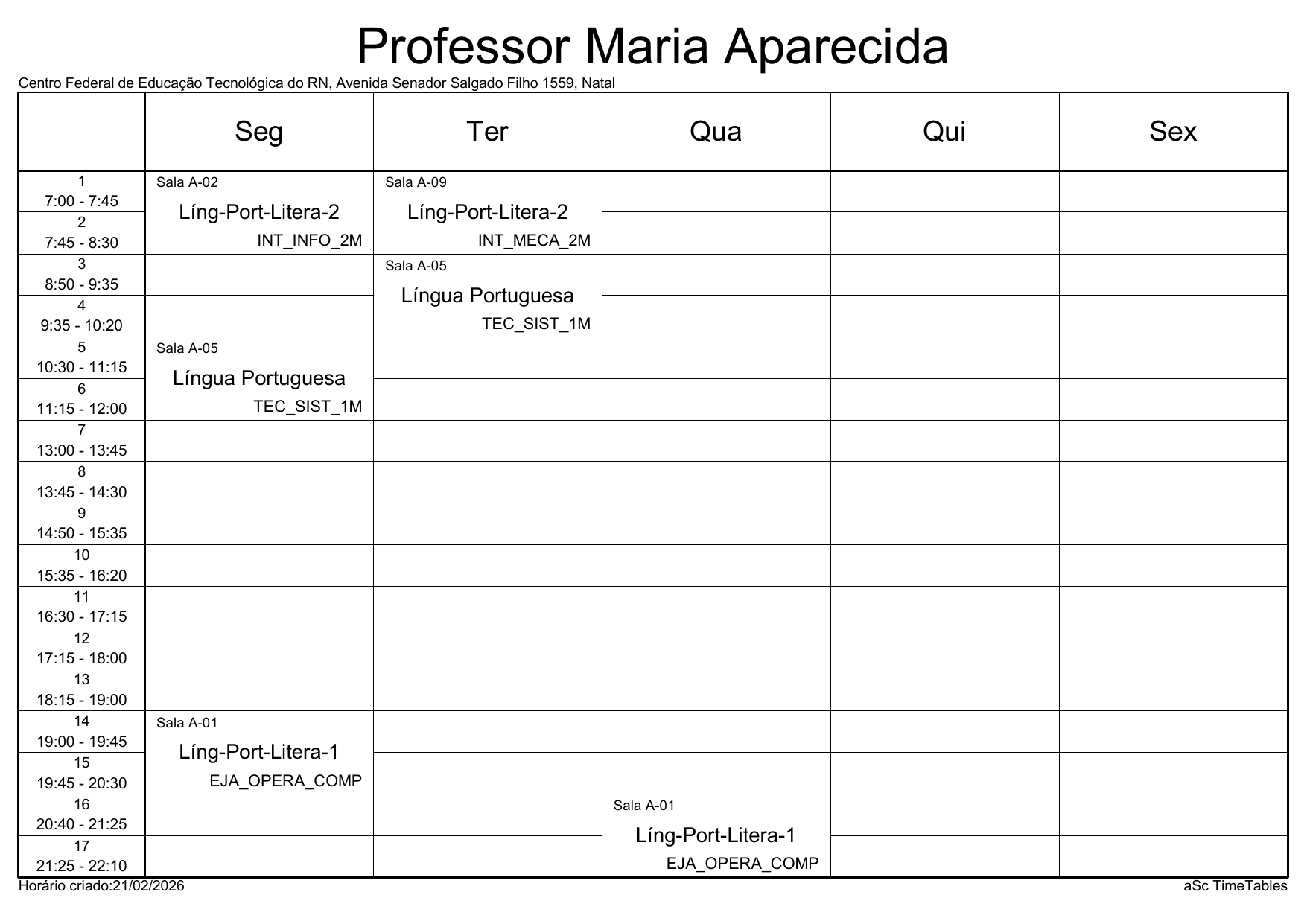 IFRN/Parnamirim: Horário Acadêmico